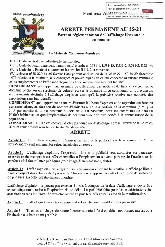 Arrêté réglementant l'affichage libre sur la commune