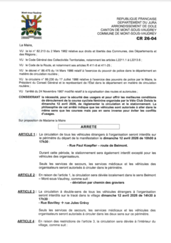 réglementant la circulation durant la course cycliste de 12 avril 2026